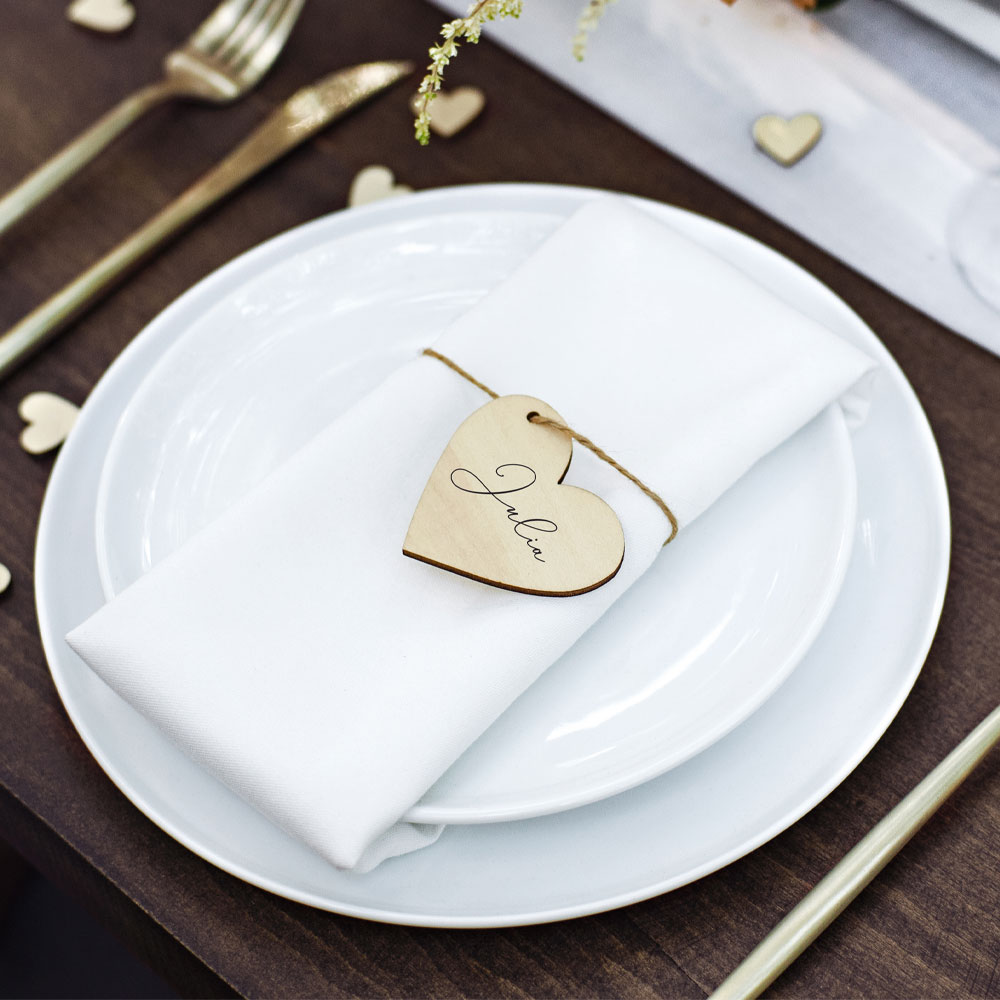 Få till en minnesvärd och unik bordsplacering med dessa fina bordsplaceringskort. Riktigt fina placeringskort i form av hjärtan i trä som du snyggt skriver gästernas namn på. Hjärtana kommer även med fina jutesnören som du snyggt kan knyta runt gästernas servetter, dricksglas eller liknande. Romantiska placeringskort som passar alldeles utmärkt till alla olika sorters bröllop.