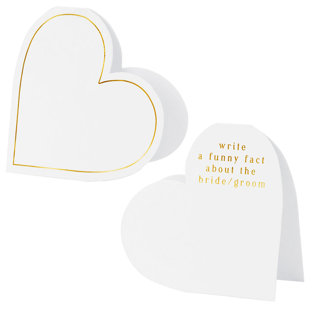 Placeringskort Hjärtan omfattar tio stycken dubbelvikta placeringskort i form av vita hjärtan med gulddetaljer samt plats att skriva rolig fakta om brud och brudgum.