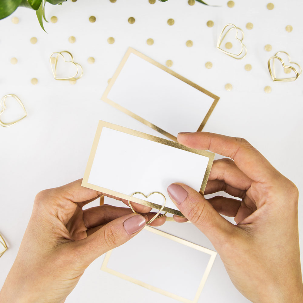 Eleganta bordsplaceringskort i vitt med kanter i skimrande guld som enkelt får din bordsplacering att se riktigt lyxig ut. Skriv ner gästernas namn på korten och lägg dem på gästernas tallrikar eller använd dig av fina placeringskorthållare som passar din fest. Snygga placeringskort som även blir en snygg dekoration till dukningen.