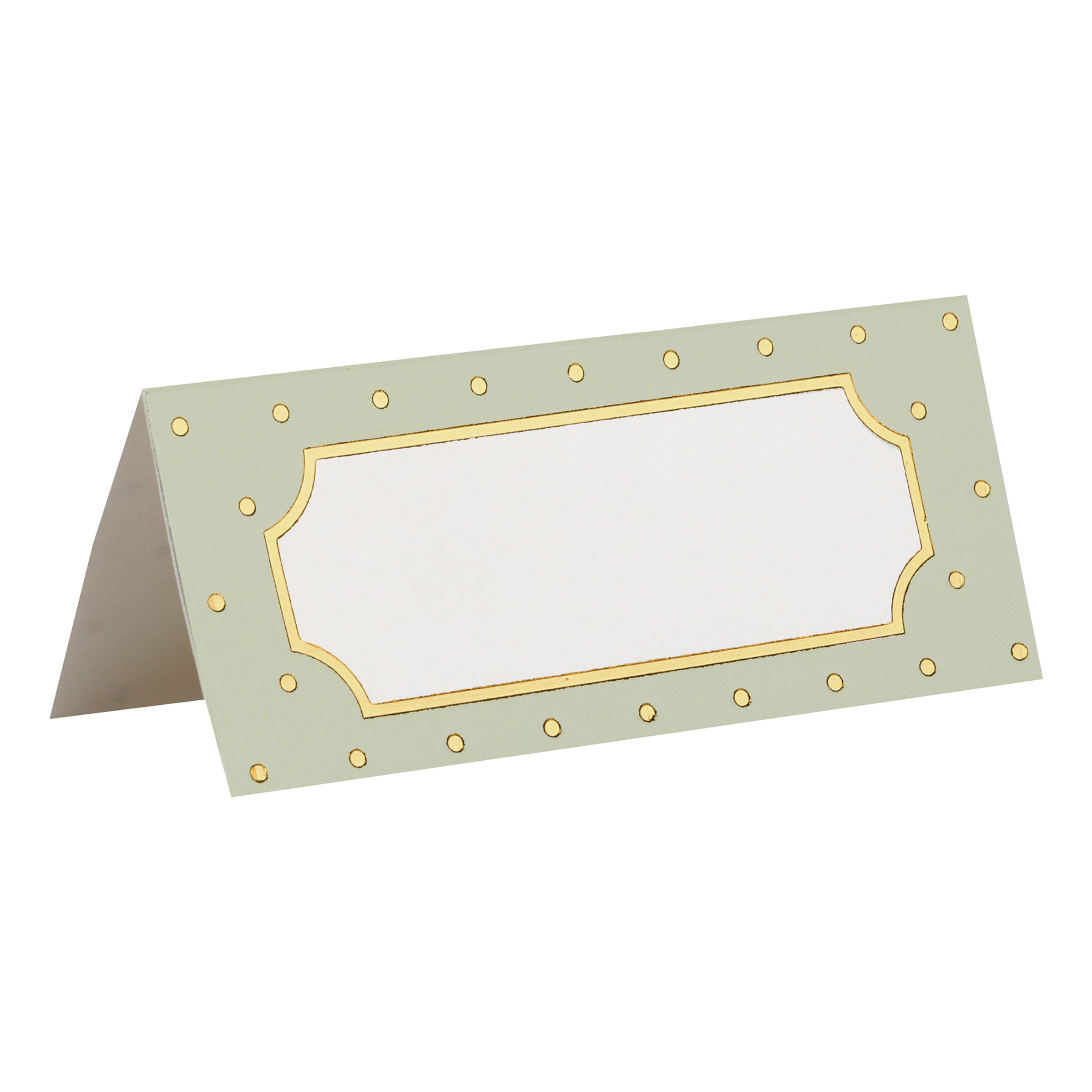 Placeringskort Prickiga Grön/Guld inkluderar tio stycken eleganta placeringskort som enkelt viker sig för att stå stadigt på bordet. Varje kort har ett blankt utrymme där du kan skriva gästens namn.