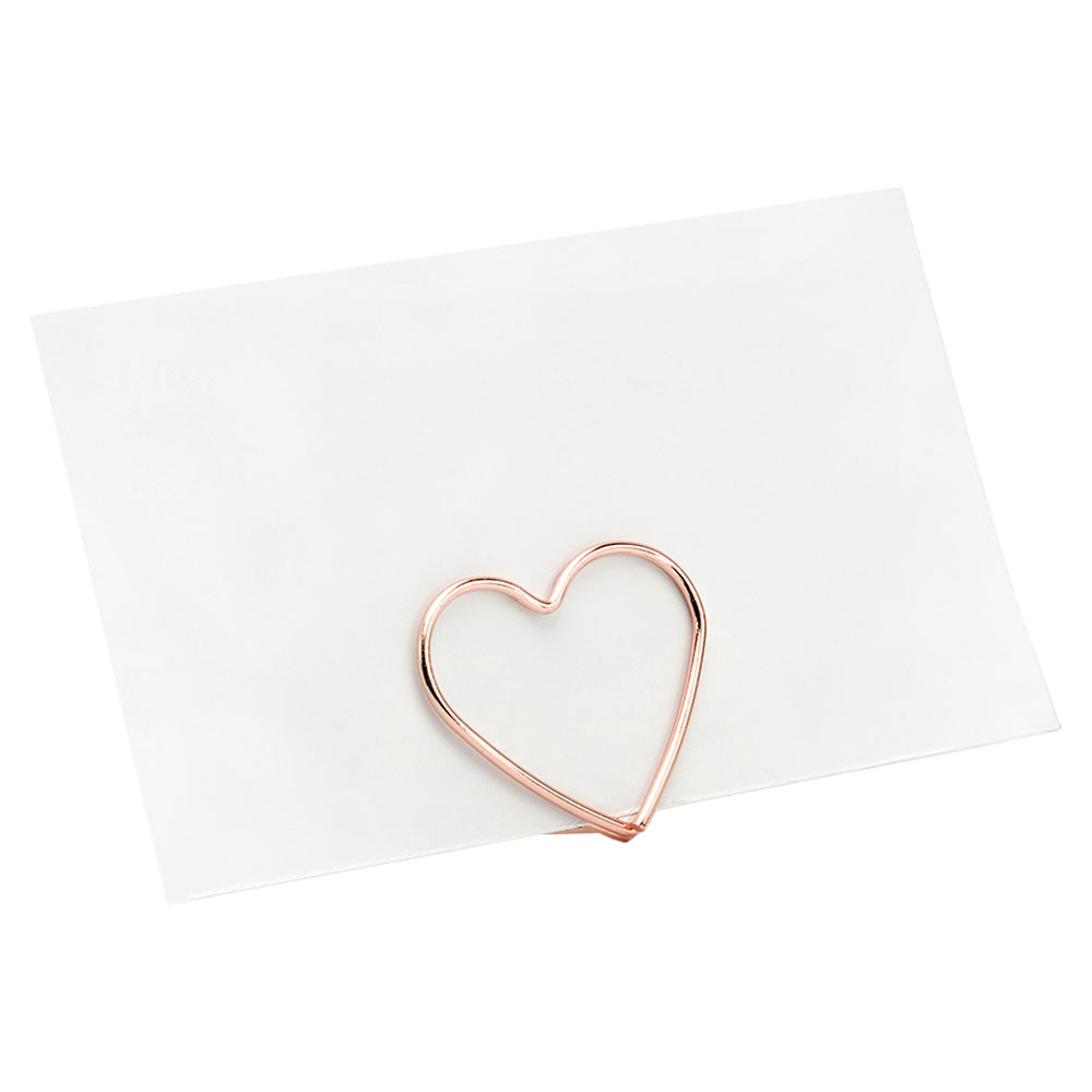 Placeringskorthållare Hjärtan Roséguld omfattar ett 10-pack roséguldiga placeringskorthållare i form av hjärtan. Hållarna är tillverkade av metall och är ca 3 cm breda samt 2,5 cm höga.
