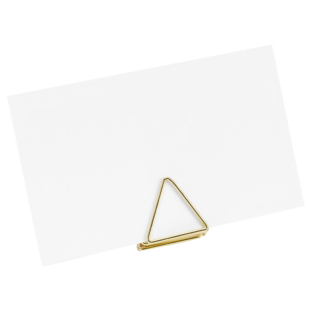 Placeringskorthållare Trianglar Guld omfattar ett 10-pack guldiga placeringskorthållare i form av trianglar. Hållarna är tillverkade av metall och är ca 3 cm breda samt 2,5 cm höga.