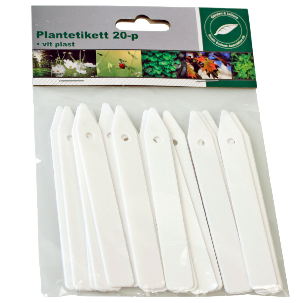 Plantetiketter Vita 20-pack omfattar tjugo vita växtetiketter i plast.