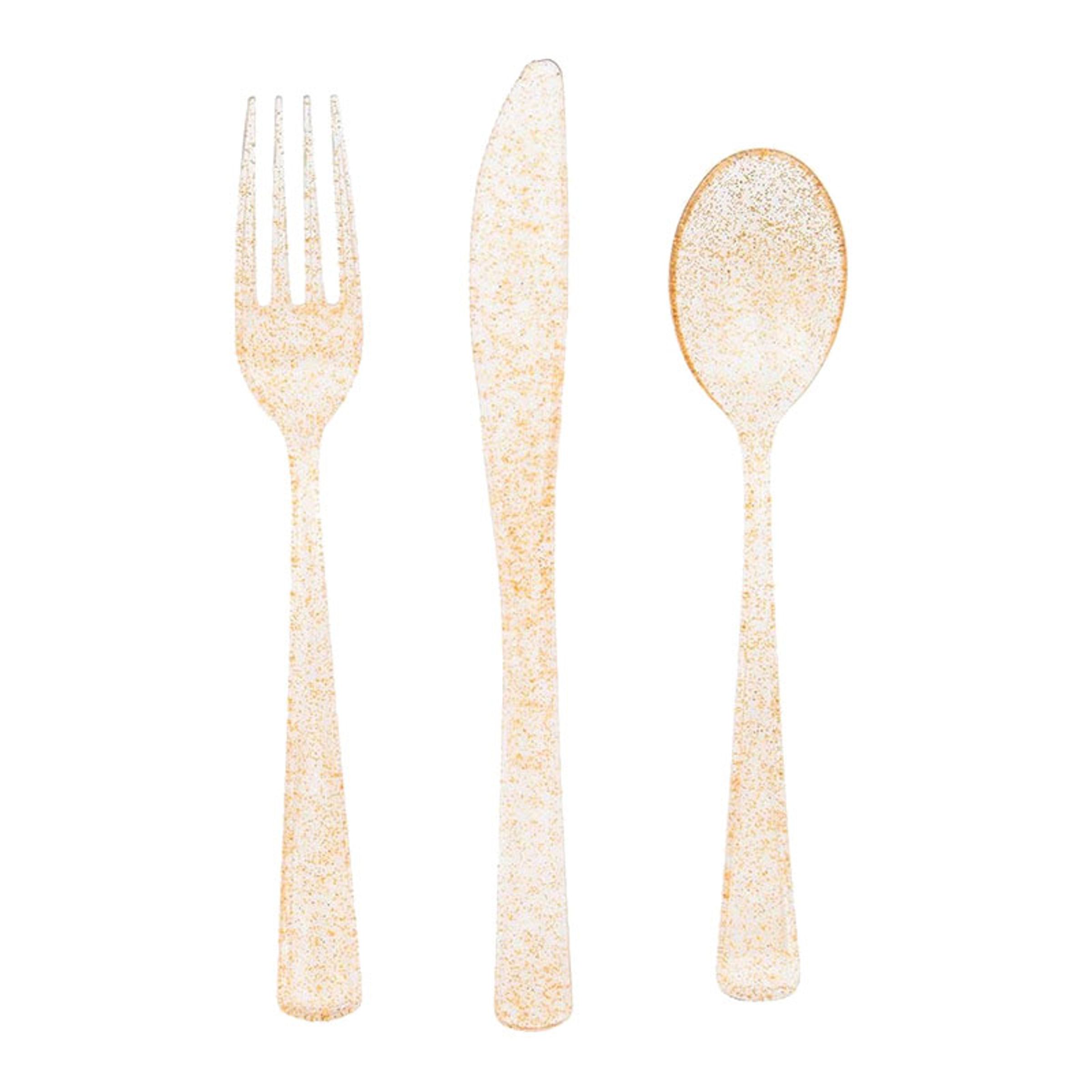 Plastbestick Guld Glitter är transparenta bestick med guldglitter som gör de extra snygga. Kan diskas för hand och återanvändas.