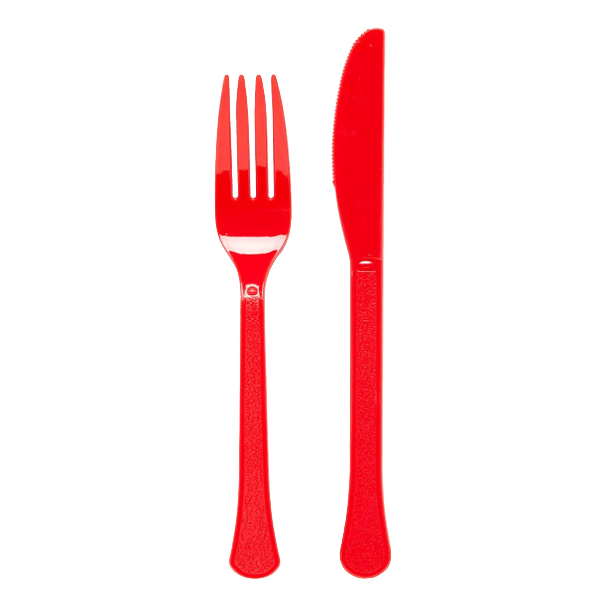 Plastbestick Röd innehåller tjugofyra smidiga bestick i plast (knivar och gafflar) som alla har en härlig ton av rött. Perfekt på halloweenfesten, studentfest, picknickar, barnkalas och andra färgglada tillställningar!