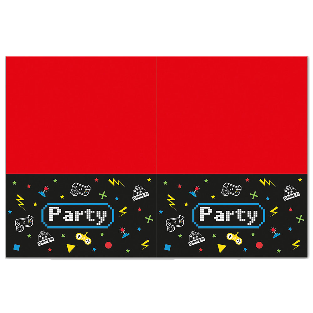 Plastduk Gaming Party omfattar en svart och röd plastduk med gaming motiv som är ca 120 x 180 cm stor.