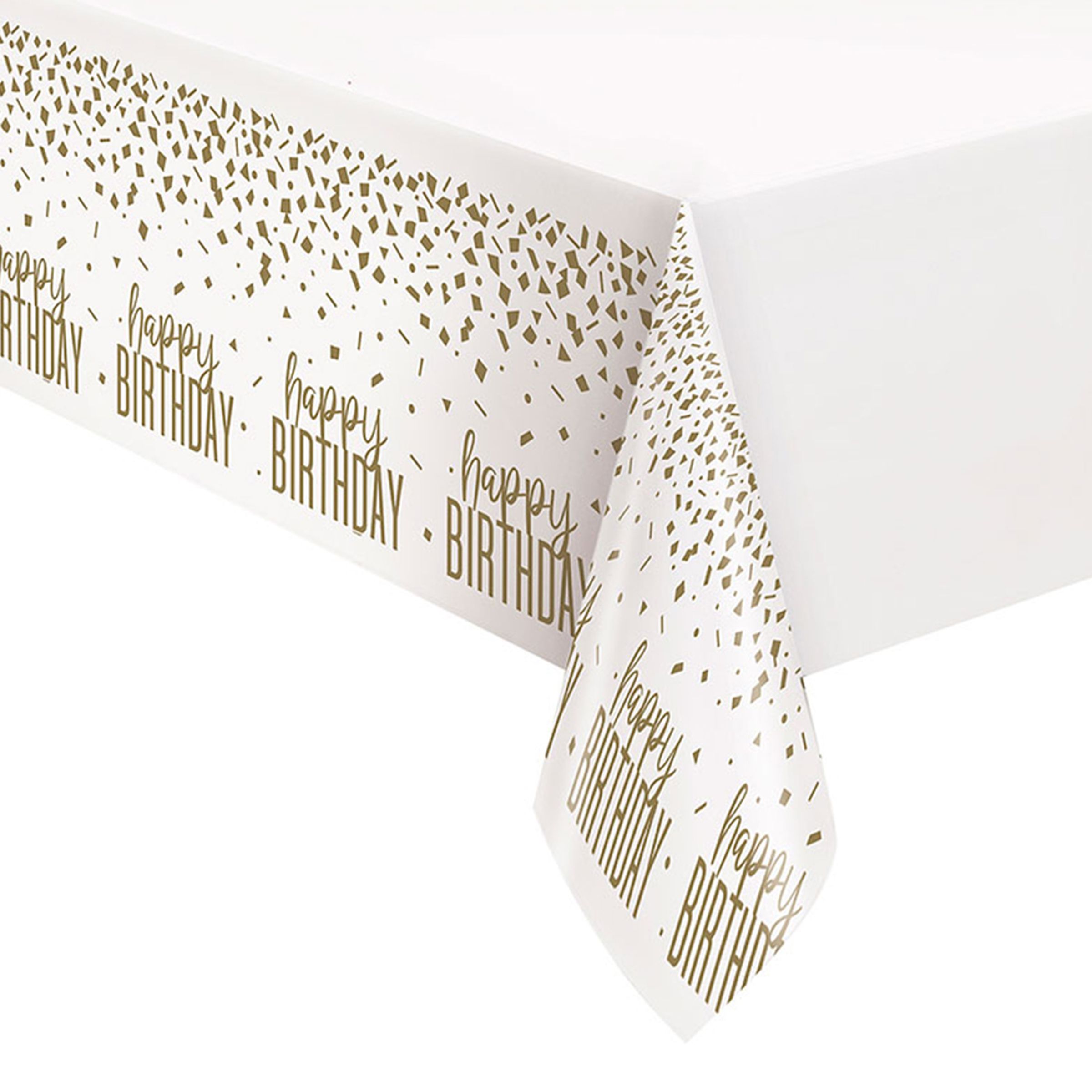 Duken kommer i vit färg med guldigt motiv och texten "Happy Birthday". Ovanför texten syns guldigt konfetti – festligt värre!
