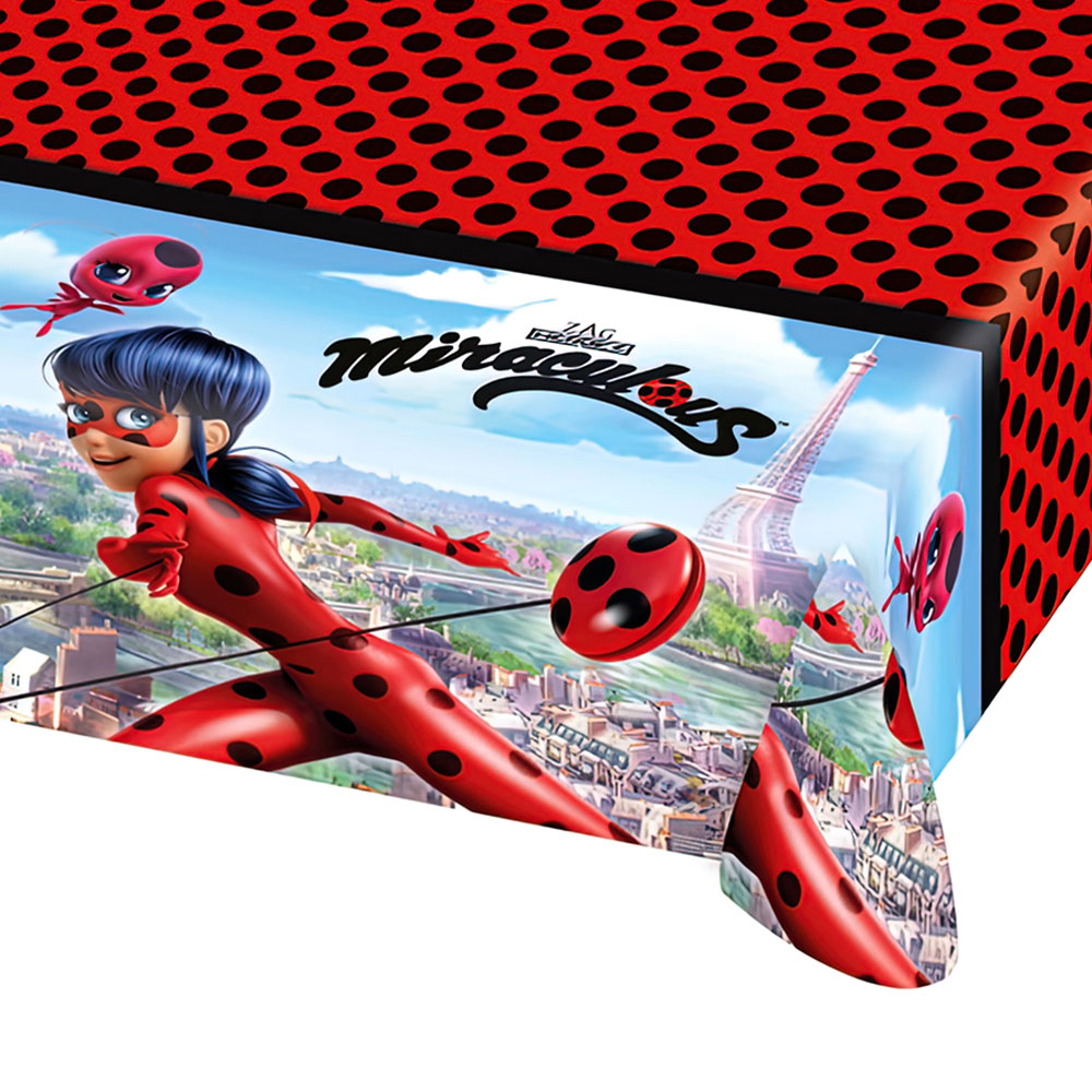 Plastduk Miraculous Ladybug omfattar en bordsduk i tunn plast, duken är röd med svarta prickar och har längs kanten motiv av Miraculous Ladybug i rött och svart på bakgrund av Paris. Plastduken är ca 120 cm bred och 180 cm lång.