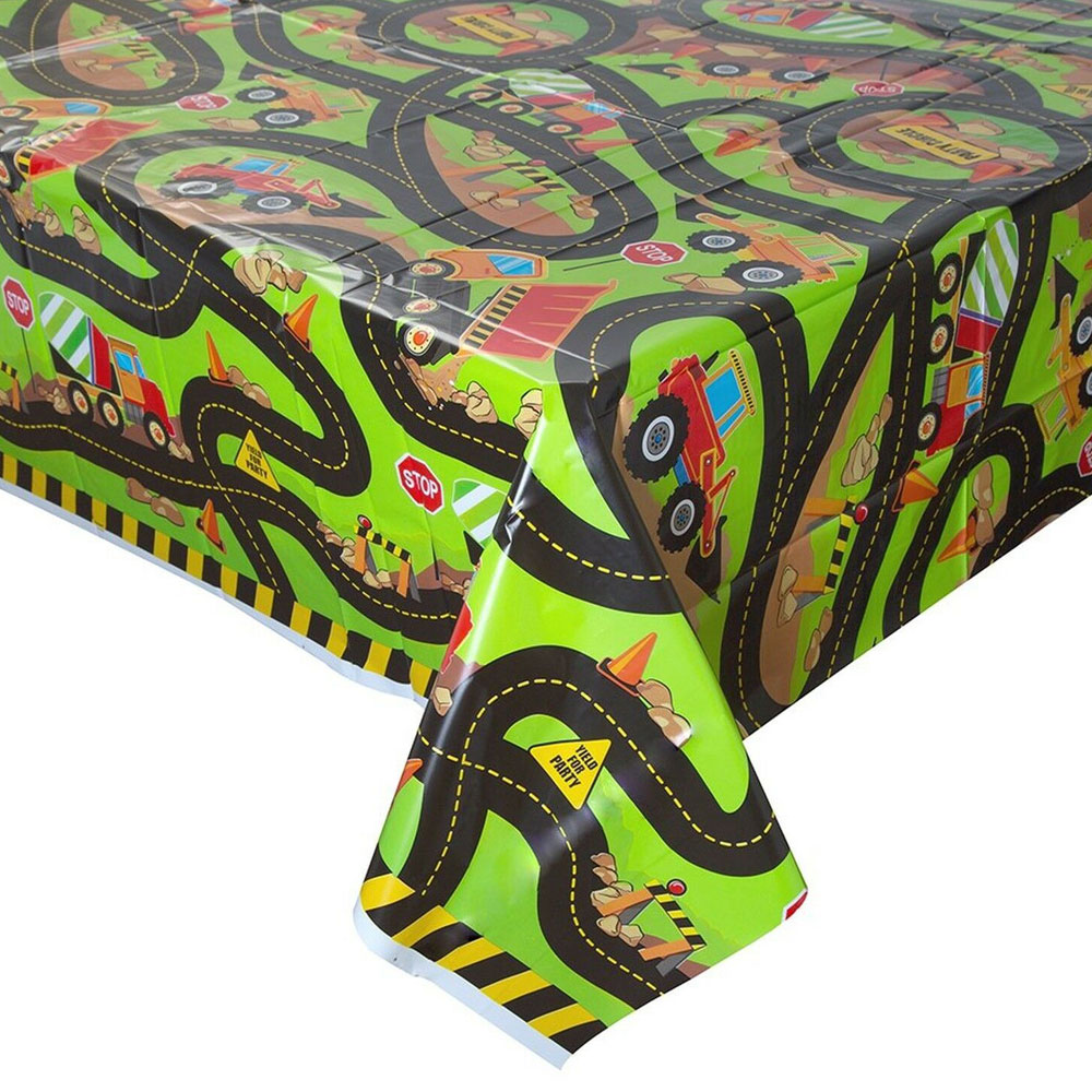 Plastduk Traktor består av en bordsduk med härligt motiv av lastbilar och traktorer som arbetar vid en lång snirklig väg. "Stop"-skyltar och skyltar med texten "Fun Ahead" pryder även dukens arbetsplats-illustration. Duken är tillverkad i plast.