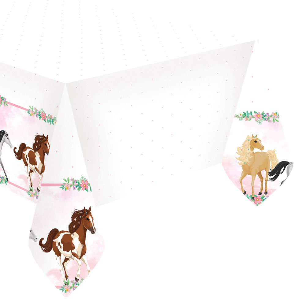 Drömmer du om ett härligt kalas i hästtema? Med denna fina bordsduk kan din dröm gå i uppfyllelse! Vacker plastduk i vitt och rosa med motiv av fina hästar som helt klart förvandlar vilket bord som helt till ett festligt kalasbord. Lägg denna engångsduk på bordet och duka upp med matchande tillbehör så är du mer än redo för att dra igång ditt hästkalas!