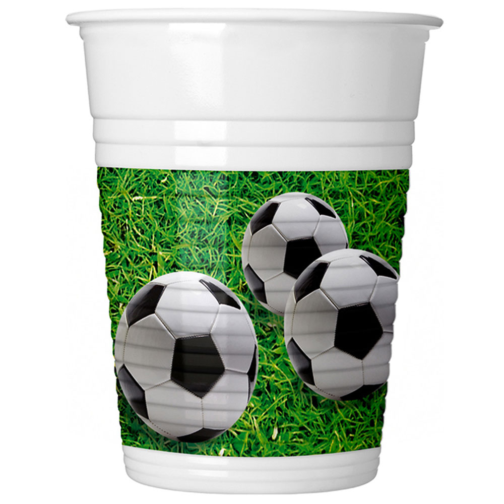 Plastmuggar Fotbollskalas omfattar åtta stycken engångsmuggar i plast med ett motiv av fotbollar i svart och vitt på grönt gräs.