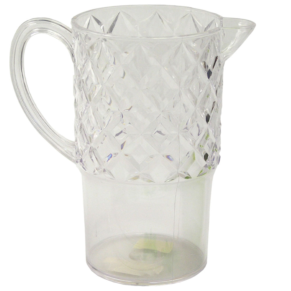 Plasttillbringare omfattar en genomskinlig karaff i plast med ett rutigt mönster upptill.