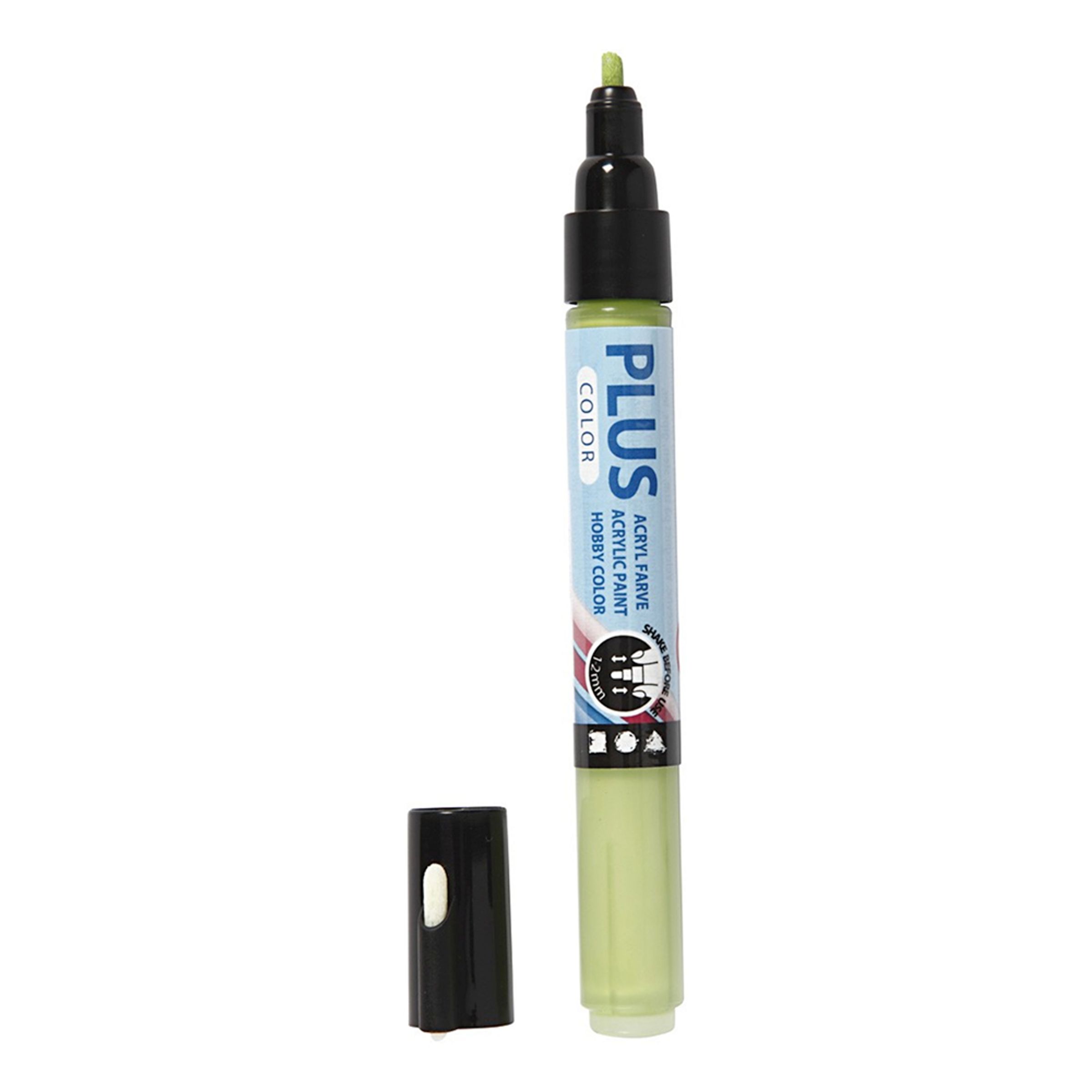 Plus Color Märkpenna är en hobbypenna som är vattenbaserad. Pennan har en heltäckande tusch och kan målas på kartong, papp, sten, trä m.m. Färgen torkar snabbt och får en silkesmatt yta. Medföljer gör även en utbytbar filtspets. Skaka alltid tuschen före användning så färgen blandas ordentligt.