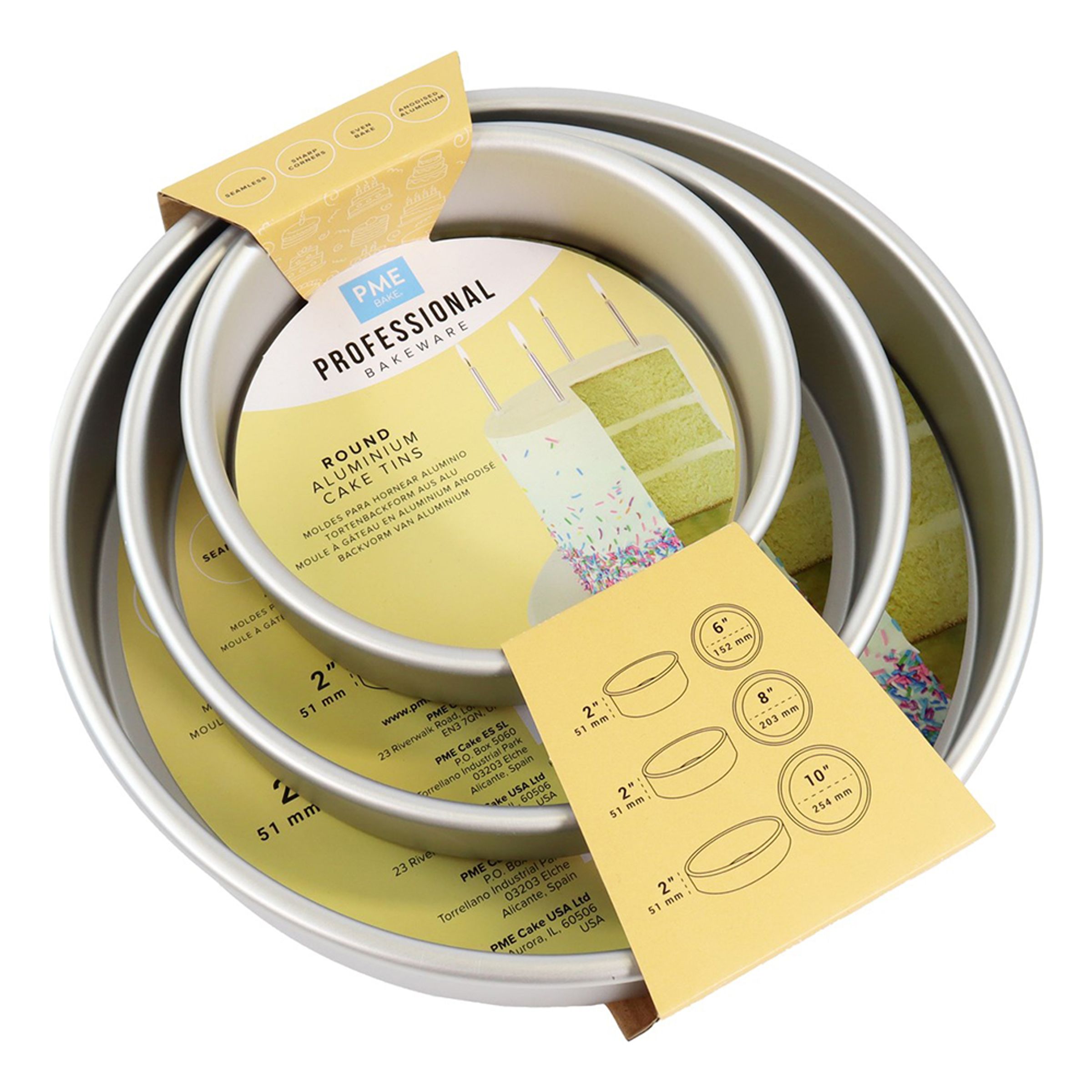 PME Bakformar Runda Set inkluderar tre runda formar i olika storlekar. PME kakformarna är gjorda av en stark och hållbar form av icke-reaktivt anodiserat aluminium vilket gör dem lätta att använda, rena och slitstarka.