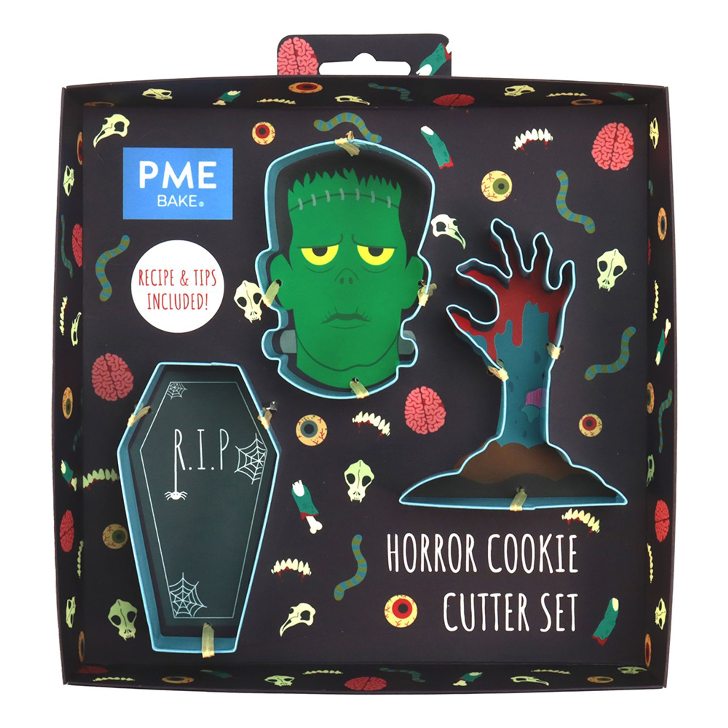 PME Kakformar Halloween Horror Kit inkluderar tre stycken kakformar som kommer formade som en likkista, Frankensteins monster och en zombiehand som kommer upp ur marken. Perfekt till halloweenkalaset!