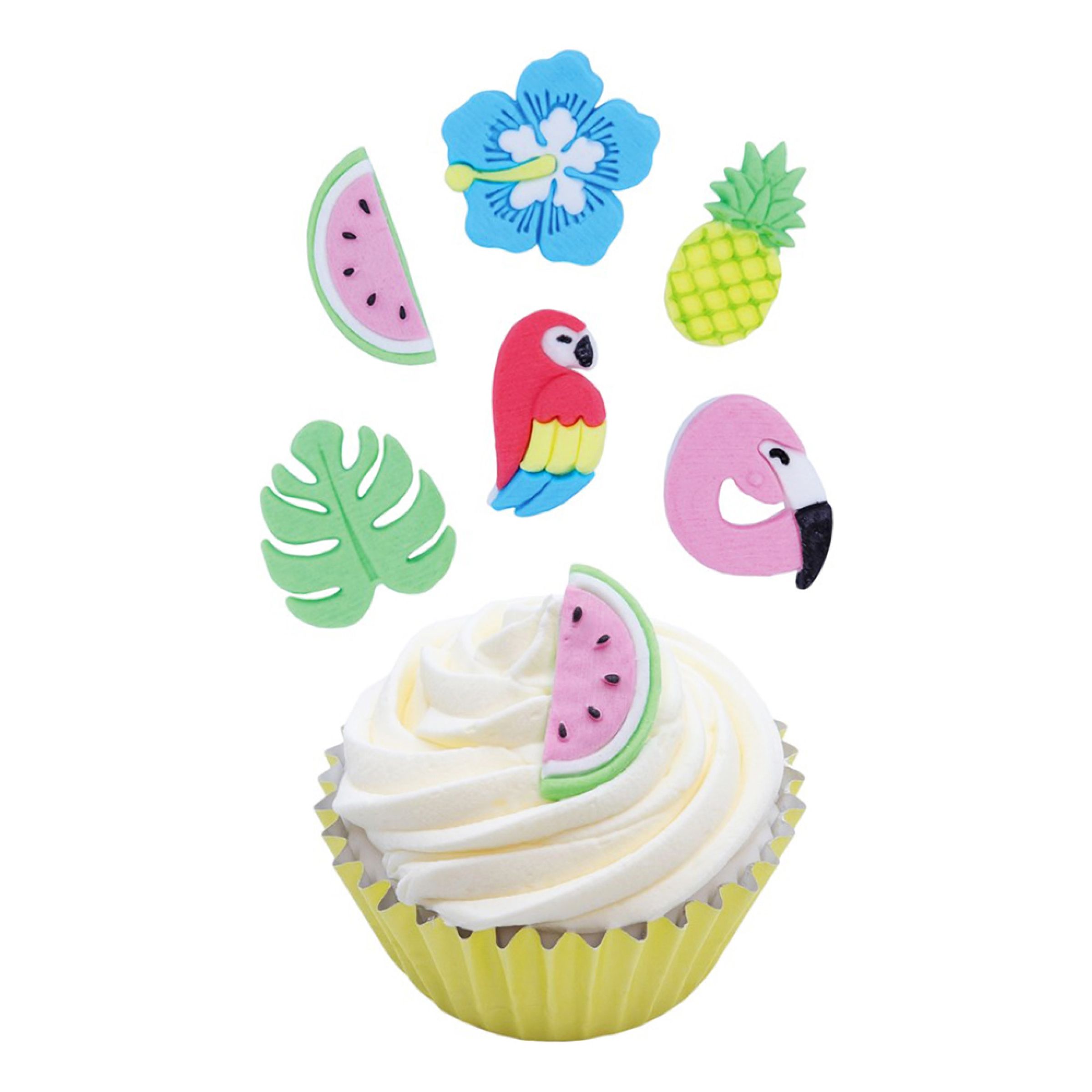 Ge dina bakverk en touch av paradiset! Toppa cupcakes, muffins eller födelsedagstårtan på kalaset med tropiskt tema med dessa ljuvliga sockerfigurer som direkt för tankarna till sol, hav och varma breddgrader.