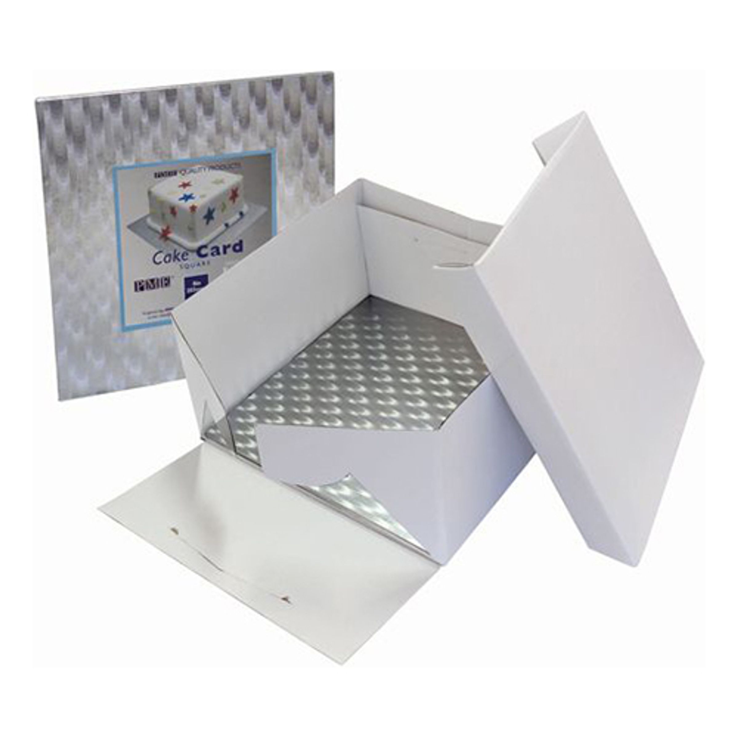 PME Tårtbox Vit med Underlägg är en vit förpackning att lägga din tårta i á la bageri-stil. Boxen kommer i 3 olika storlekar: small (ca 25 x 25 x 15 cm), medium (ca 30 x 30 x 15 cm) och large (ca 35 x 35 x 15 cm). Samtliga boxar inkluderar ett underlägg i silver (som tårtan läggs på och då enkelt kan tas ut ur boxen), den mäter ca 3 mm tjock. Boxen har ett löst lock och monteras på egen hand. Tillverkad av papp och levereras styckvis.