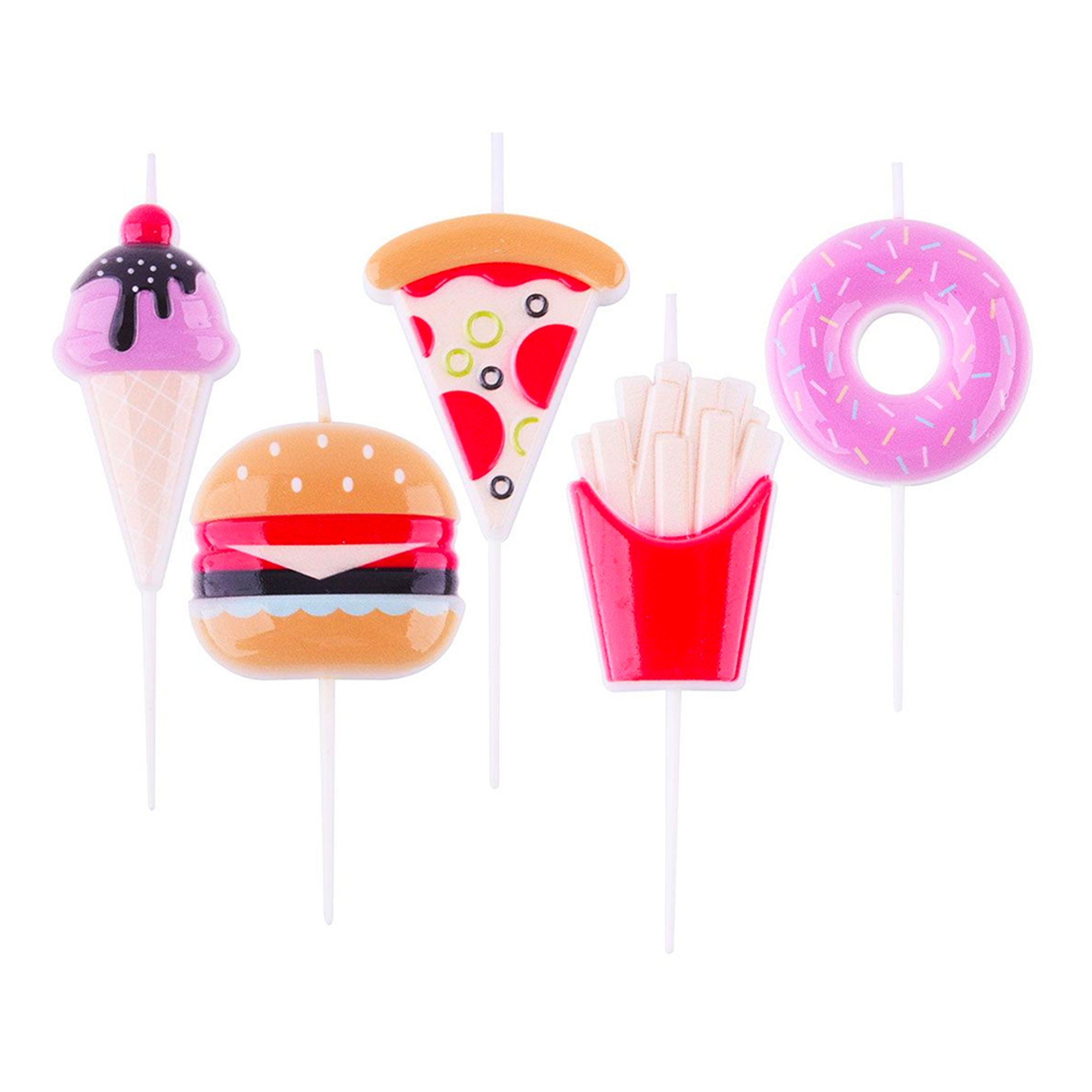 PME Tårtljus Kalasmat innehåller 5 st ljus med mat-tema, det är en glass, en hamburgare, en pizza, en pommes frites och en donut. Perfekt för sommarens alla fester och kalas!