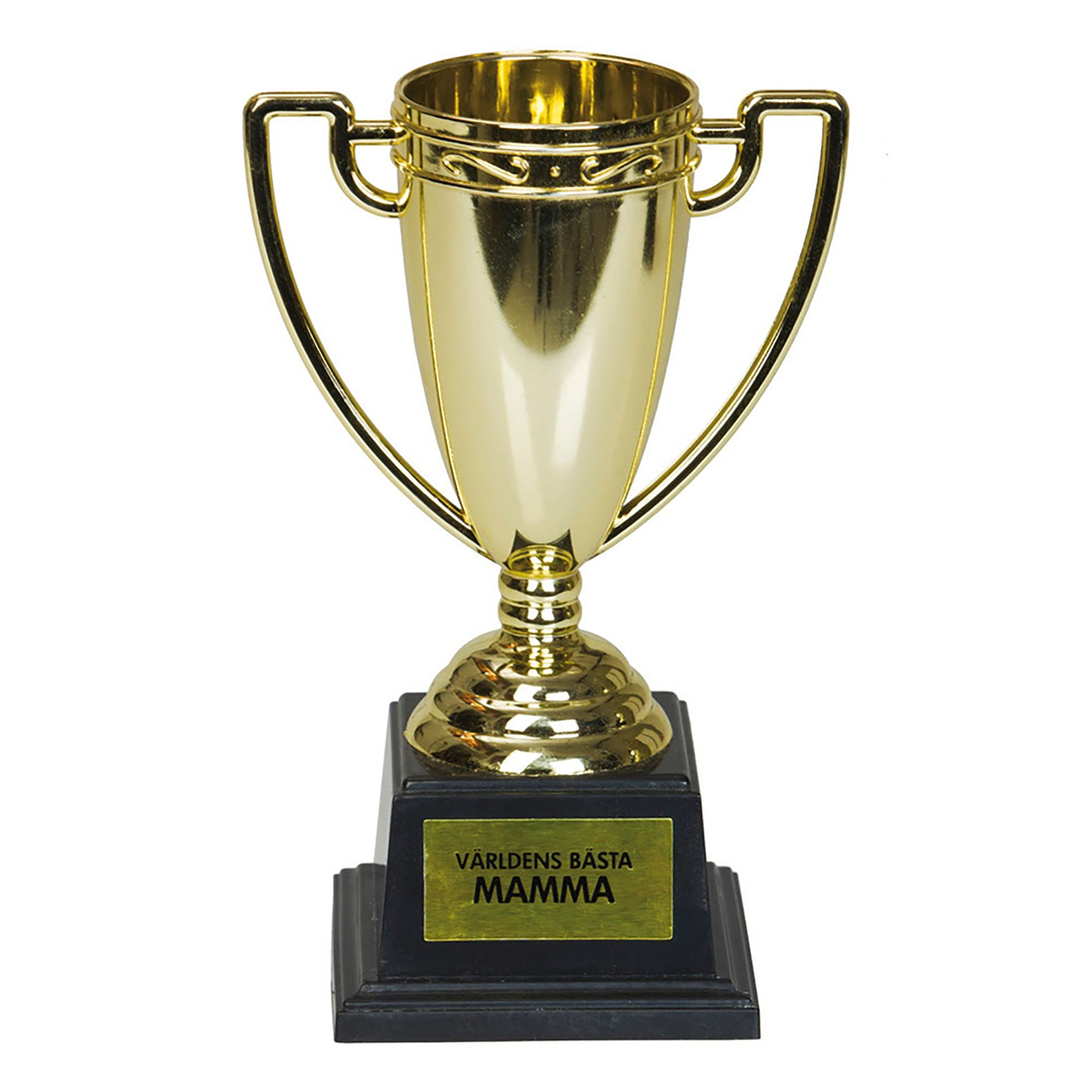 Pokal Världens Bästa Mamma är en skimrande och guldfärgad pokal på gedigen bas med en tjusig guldskylt med text. Perfekt som mors dag-present!