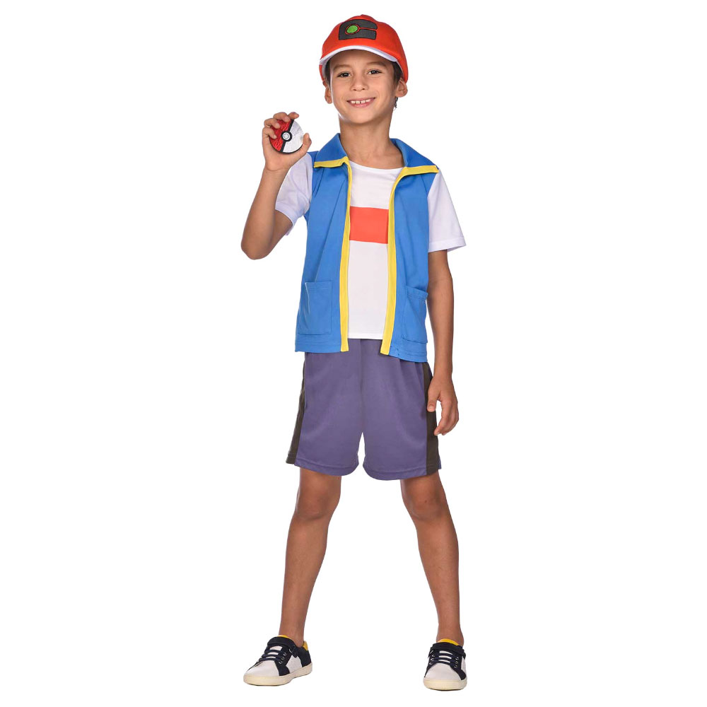 Pokémon Ash Maskeraddräkt omfattar en utklädnad som föreställer Ash från Pokémon, dräkten innehåller en broderad keps, en kombinerad väst och t-shirt och shorts med resår. Dräkten finns i olika storlekar för barn i olika åldrar.
