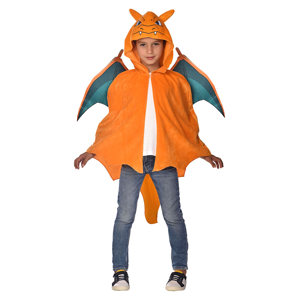 Pokémon Charizard Maskeraddräkt Barn omfattar en dräkt i form av Pokémonkaraktären Charizard. Dräkten har en orange huva med öron, ögon, nos och mun i svart med två vita tänder, vingar i orange och mörkt grönt och orange svans med en liten eldslåga på tippen. Dräkten träs på likt en mantel med knäppning i halsen. Passar barn.