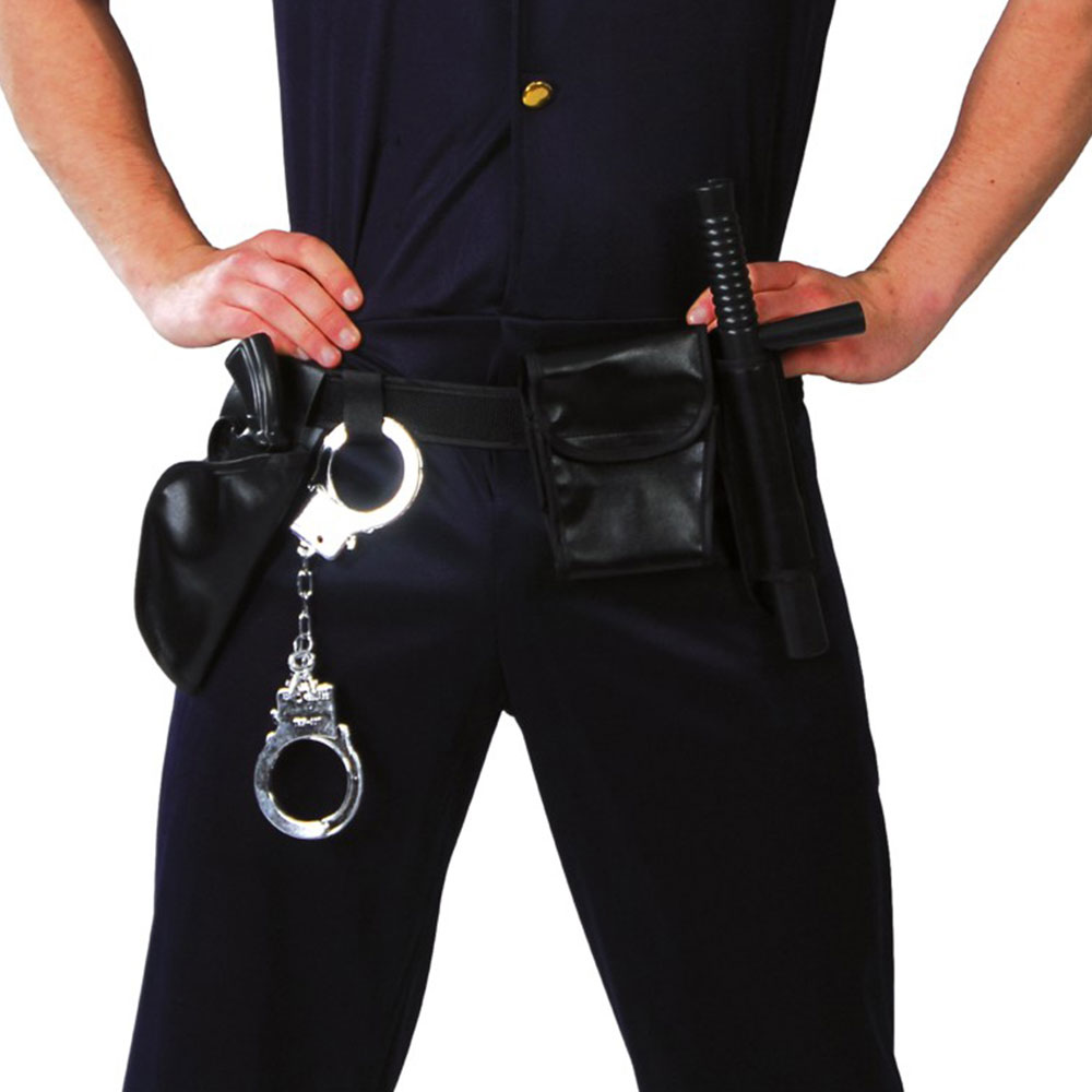 Polis Tillbehörsbälte omfattar ett polis tillbehörsbälte med en svart pistol, en svart batong och silverfärgade handklovar med nycklar.