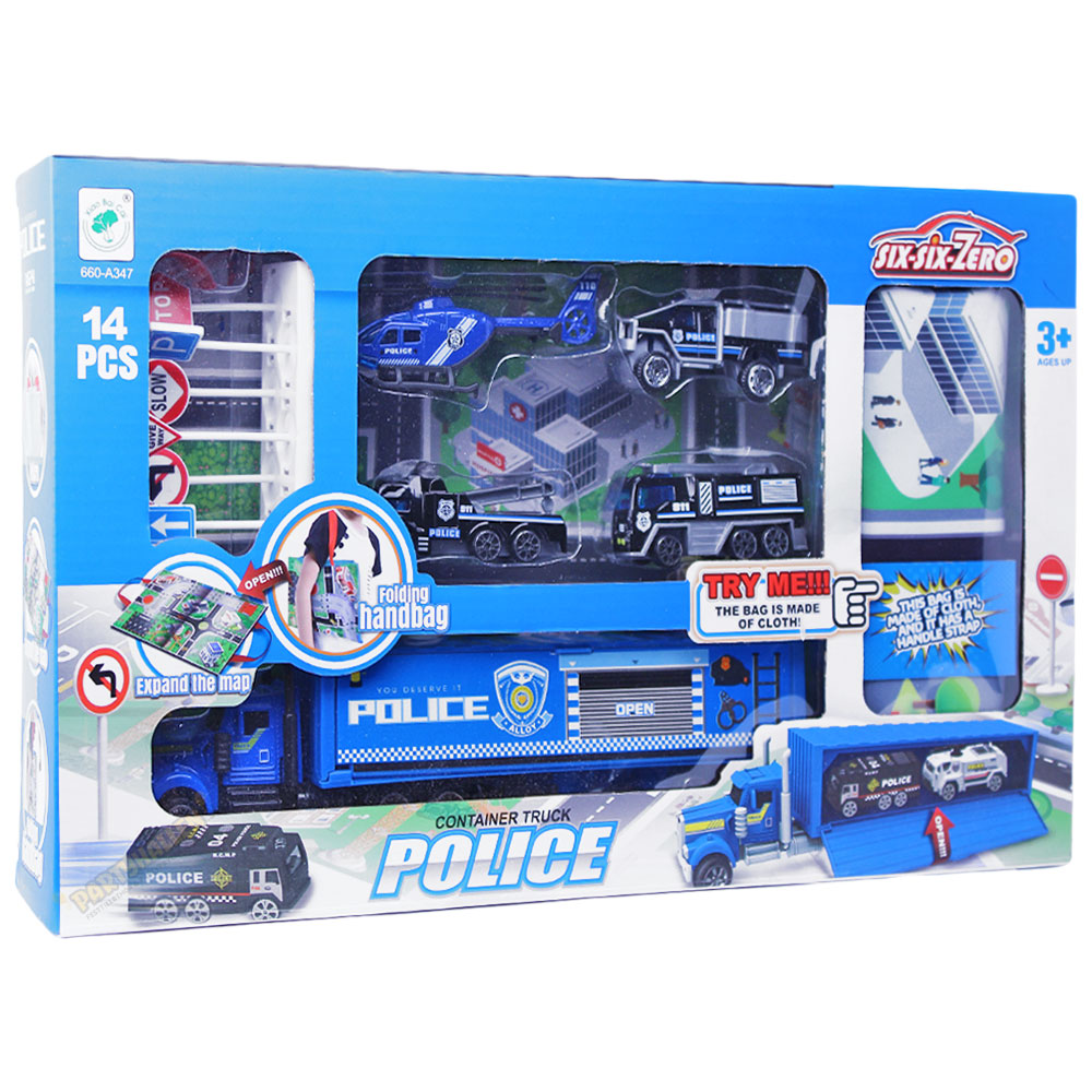 Polisbilar Leksakskit omfattar ett set blå leksaksbilar i metall med polistema med vägskyltar och lekmatta. Det finns tre mindre polisbilar i olika varianter, en mindre helikopter och en större lastbil med släp där två av dom mindre bilarna får plats. Sju stycken vägskyltar och en lekmatta med stads- och vägmotiv som kan vikas ihop med kardborreband och handtag medföljer.