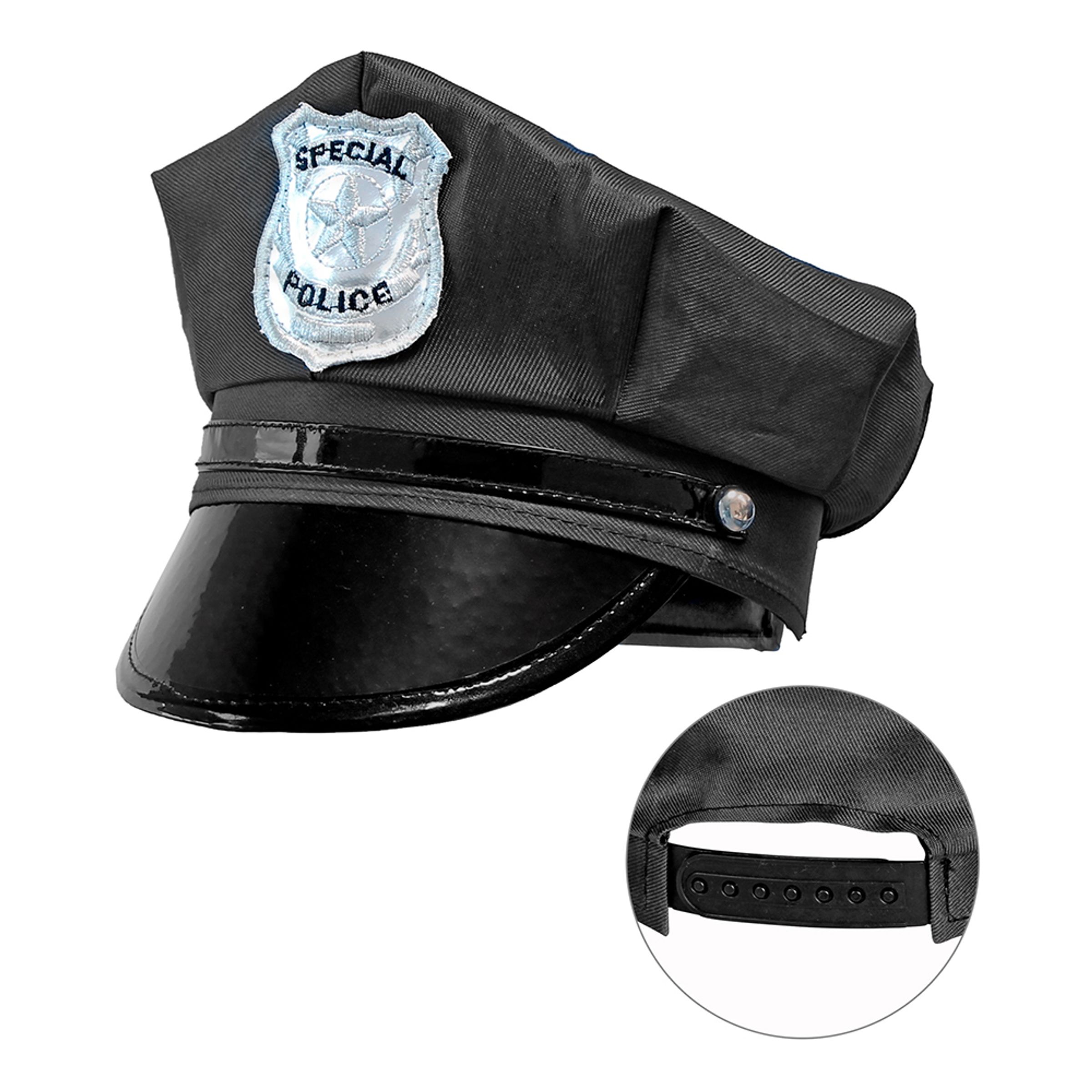 Polishatt Justerbar kommer i storleken One size och har ett justerbart spänne bak. Hatten är svart, tillverkad i polyester och passar lika bra till halloweenfesten som till tjuv- och polisfesten.