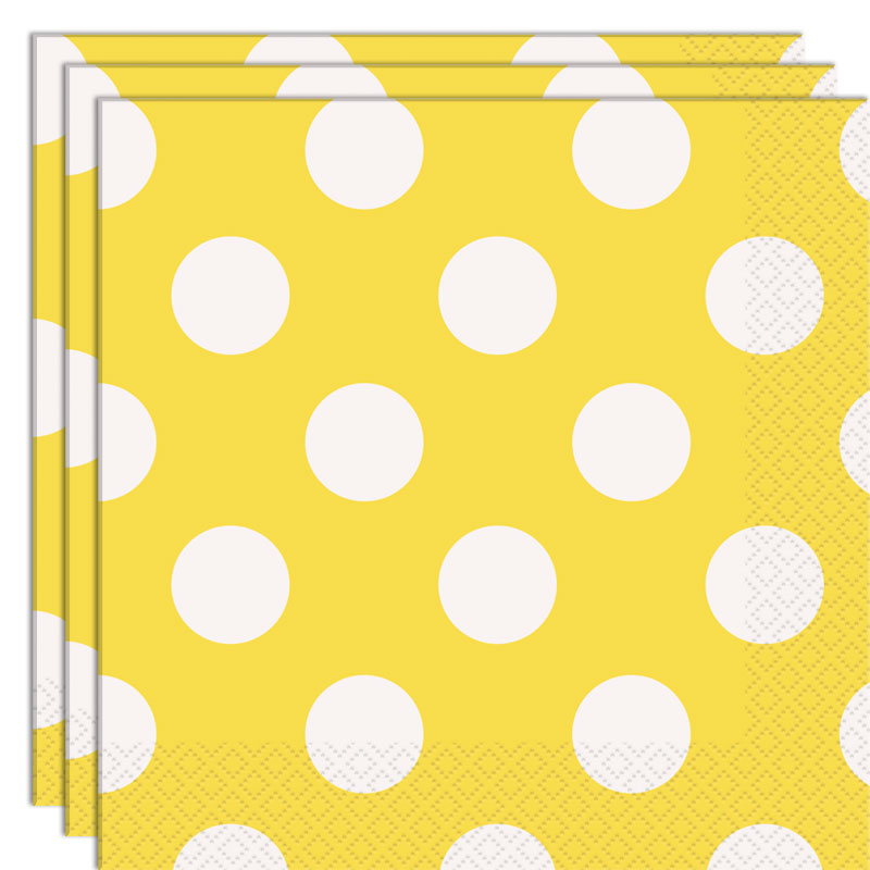 Polka Dot Gula Servetter innefattar ett paket med gula servetter i två lager med vita prickar.