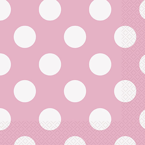 Polka Dot Ljusrosa Servetter omfattar ett 16-pack ljusrosa pappersservetter med vita prickar. Servetterna har två lager och mäter 33 x 33 cm utvikta.