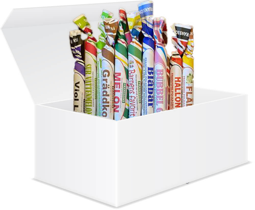 Denna box tog vi fram till Polkagrisens Dag 20:e april. Den innehåller hela 15 st olika polkagrisar.