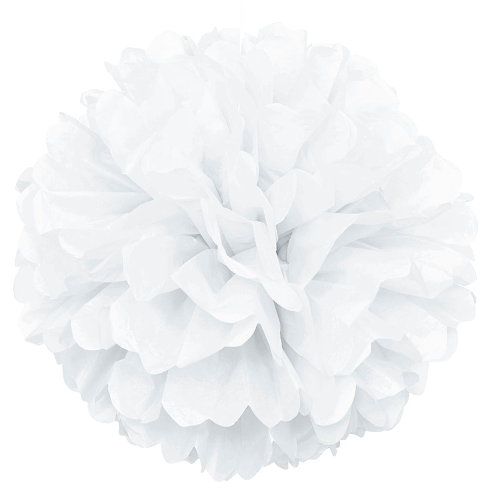Pom Pom Dekoration Vit omfattar en vit, hängande pom pom dekoration av silkespapper. Dekorationen är ca 40,6 cm stor och kommer med snöre för upphängning.