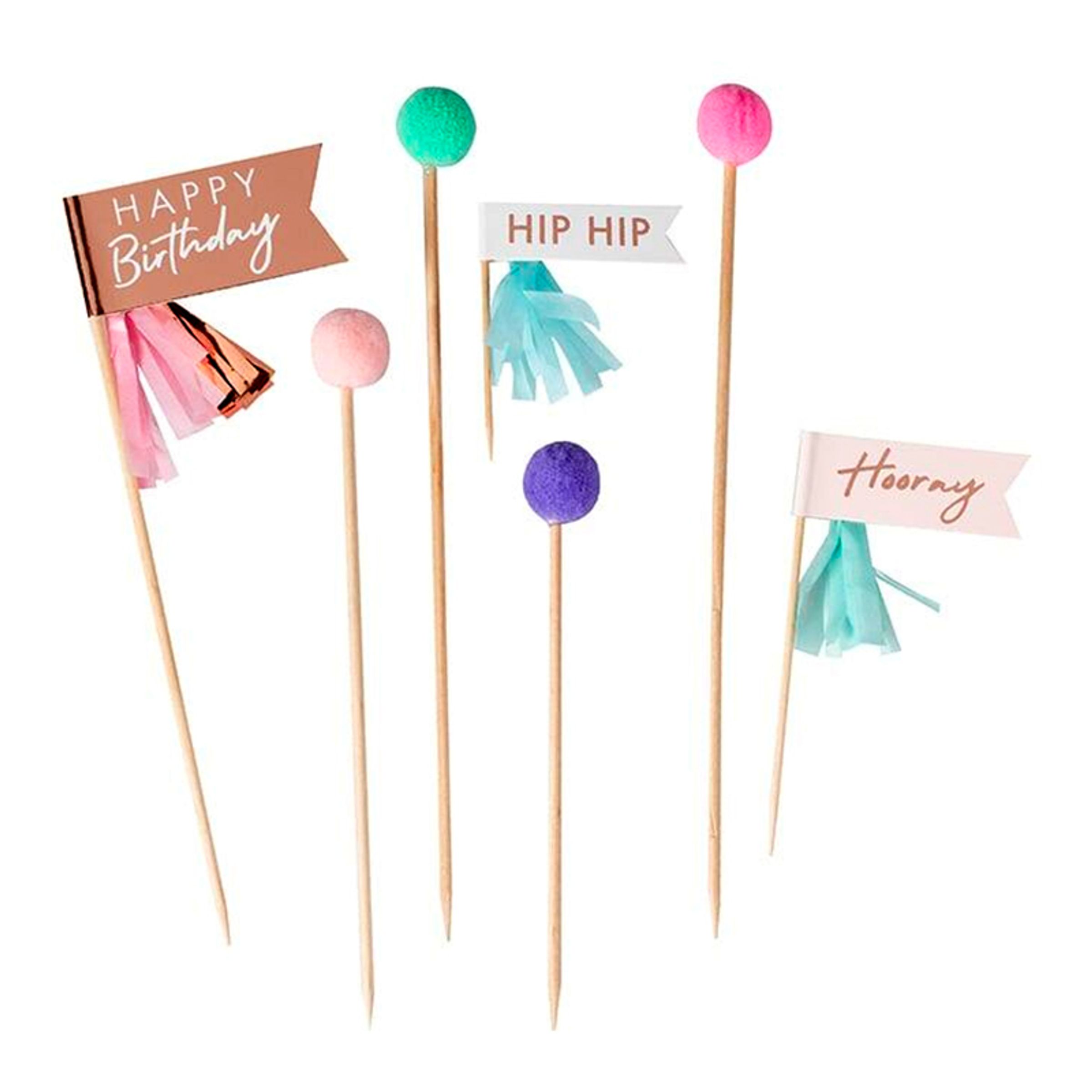 Pom Poms Happy Birthday Tårtdekoration är ett kit med blandade dekorationspinnar i varierande storlekar mellan 7-18 cm. I kittet ingår det 3 stycken pinnar med olika budskap, 4 stycken pompompinnar och 4 stycken pappers tassels.