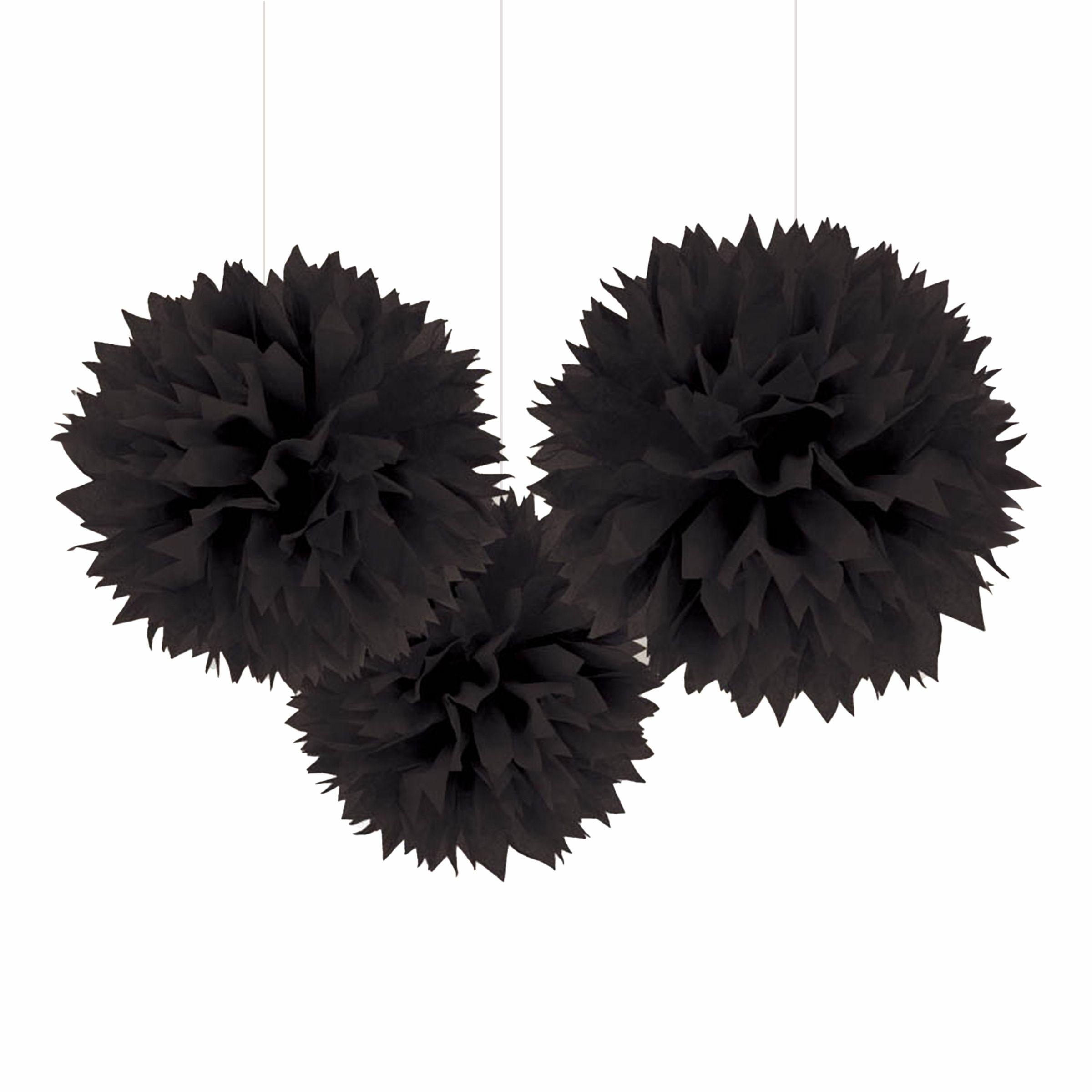 Pom-Poms Svarta Takdekoration består av tre stycken fluffiga pompoms som du enkelt hänger upp i taket med egen tejp eller liknande. Perfekta som halloweendekoration eller när du vill färgmatcha partajet!