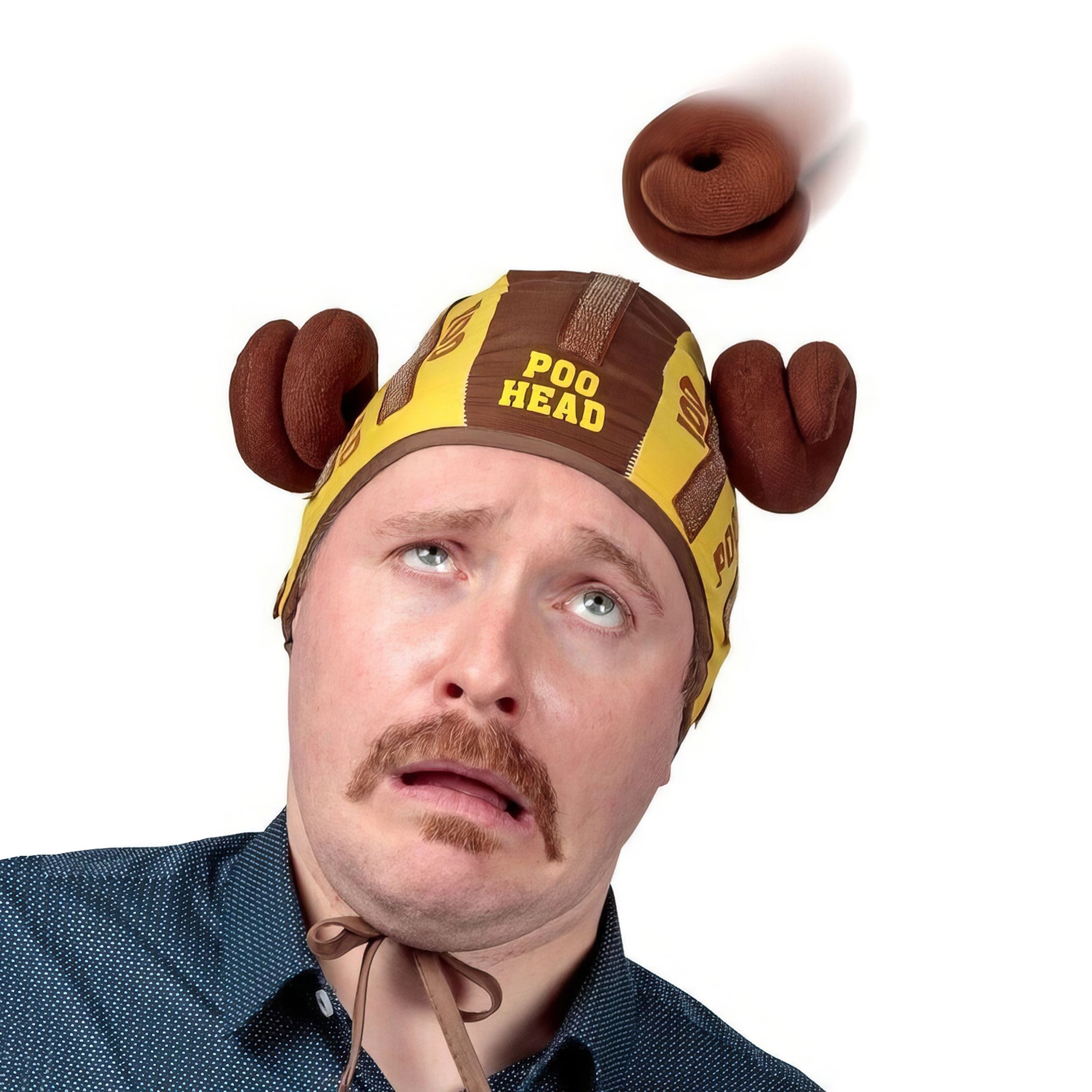 Poo Head Spel består av en mössa med kardborre och tre mjuka bajskorvar. Ta på dig mössan och låt din kompis kasta bajskorvarna på ditt huvud och se om alla tre lyckas fastna. Om så är fallet, är du ett tvättäkta Poo Head!