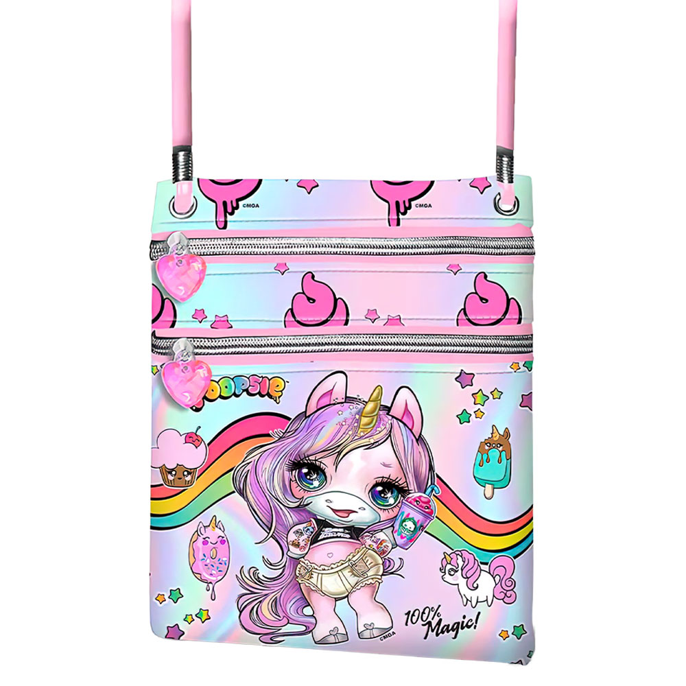 Poopsie Axelremsväska omfattar en liten väska i polyester med glansiga pastell- och regnbågsfärger och Poopsie motiv i mjuk plast. Väskan har två fack med rosa dragkedjor och små diamanthjärtan samt rosa glansigt axelband fäst framtill. Väskan är ca 16,5 cm hög och 15 cm bred.