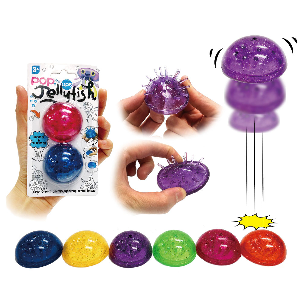 Pop-Up Jellyfish 2-Pack består av två maneter i lila och rosa som poppar upp när de trycks fast på plana ytor.