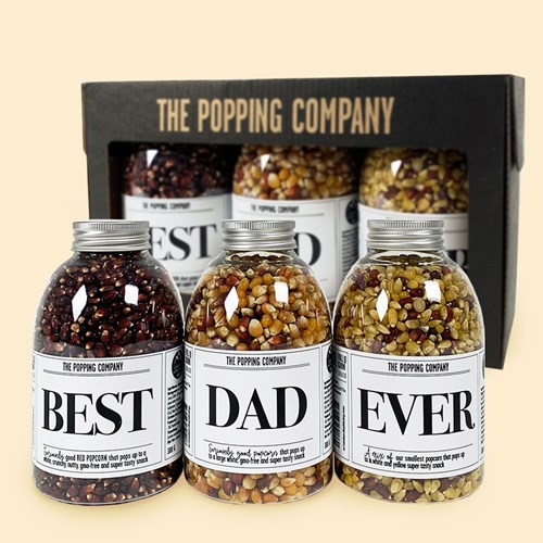 Ge bort en presentlåda full av gourmetpopcorn till "Best Dad Ever". Popcornen kommer från The Popping Company, en svensk liten popcornfabrik i Åre. I presenten får du tre olika sorters popcornkärnor i fina flaskor med meddelandet: Best Dad Ever. Perfekt till farsdag! Ni kan antingen poppa en smak i taget eller mixa som ni själva vill i samma kastrull.