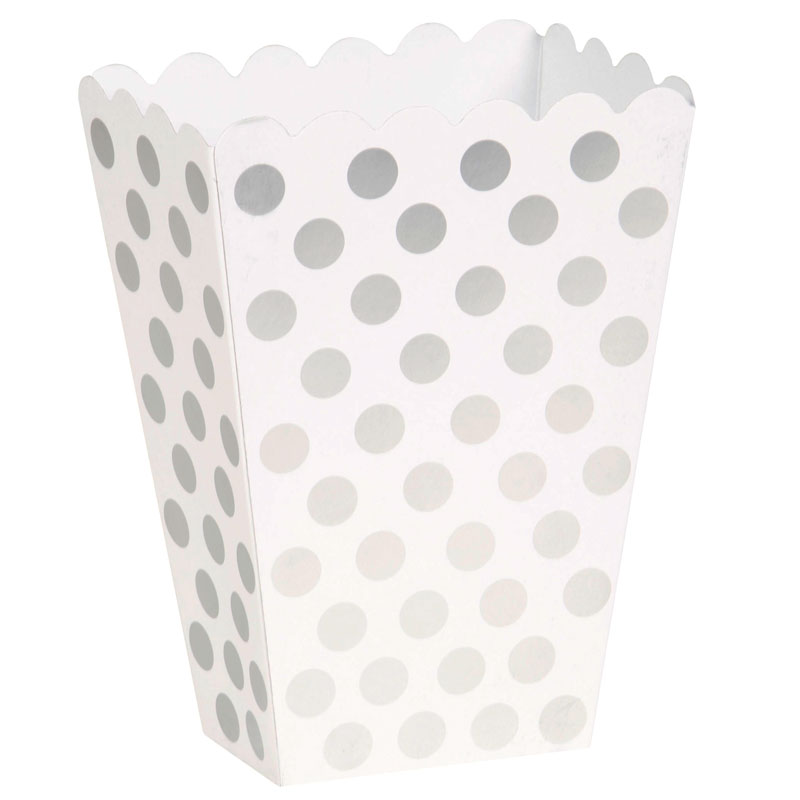 Popcornbägare Vit/Silverprickiga omfattar ett 8-pack vita engångsbägare av papp med silvriga prickar. Bägarna är ca 13,5 cm höga, 7 cm breda samt 4,2 cm djupa.