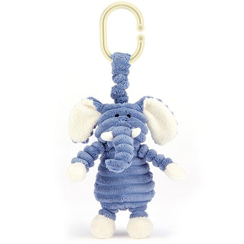Elefant-gosedjur med ett snöre att dra upp i ett greppvänligt handtag i plast. När snöret släpps dras det in med en vibrerande kraft som får mjukdjuret att skaka och darra. Perfekt att hänga upp i handtaget ovanför sängen eller i barnvagnen så att babyn kan dra elefanten till sig.