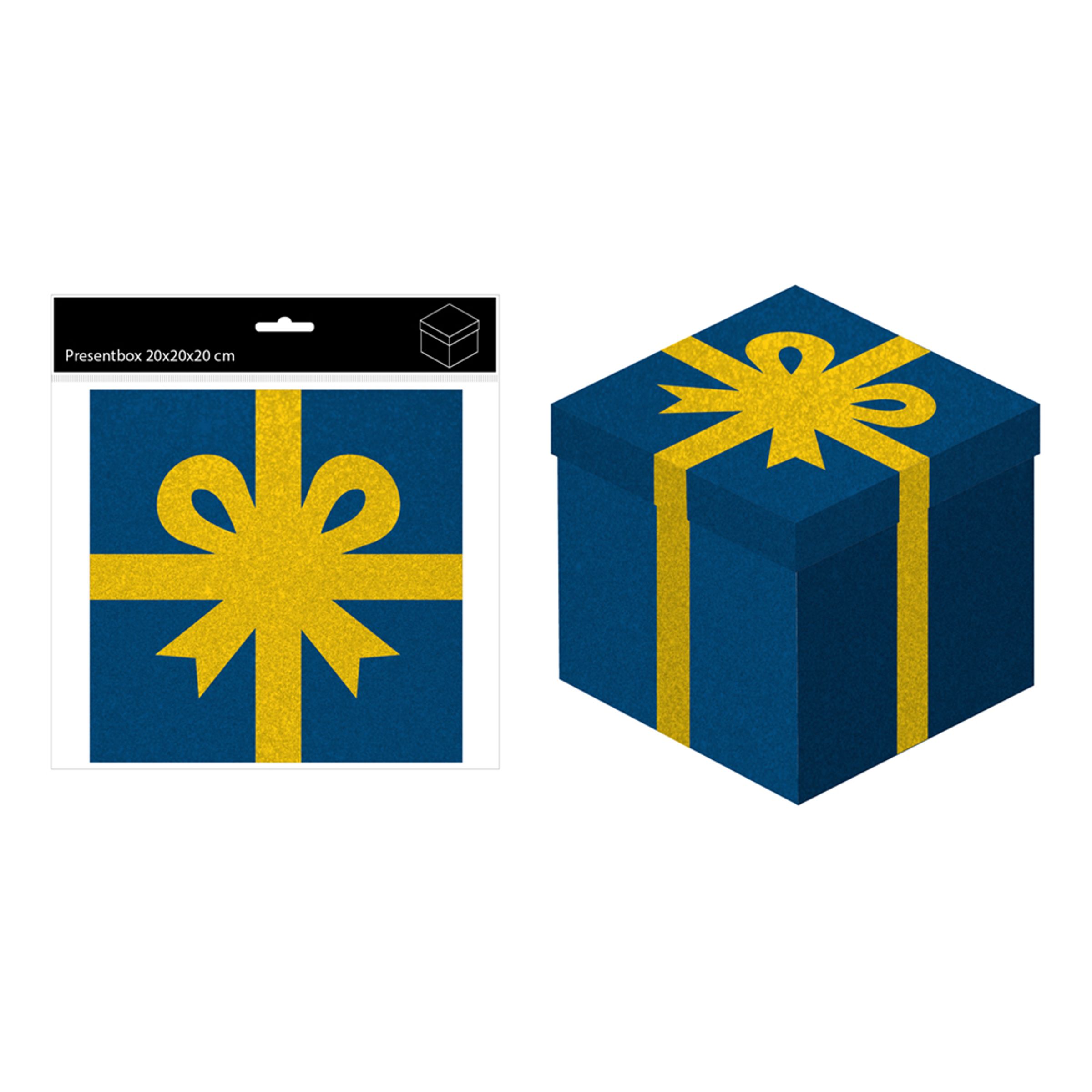 Presentbox Blå/Gul/Glitter är en blå presentbox med ett gult och glittrigt band. Till boxen kommer ett lock. Asken är tillverkad i papp och den mäter 20 x 20 x 20 cm stor.