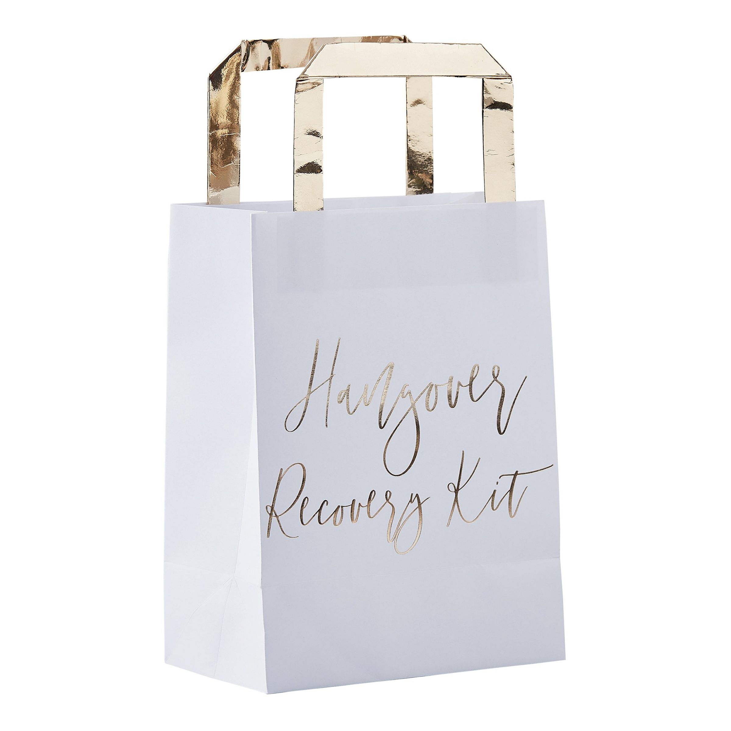 Presentpåsar Hangover Recovery Kit inkluderar fem vita påsar med guldfärgade handtag och texten "hangover recovery kit". Använd för att fylla med nödvändiga prylar till gästerna att klara av en bakfylla när de går hem från festen!