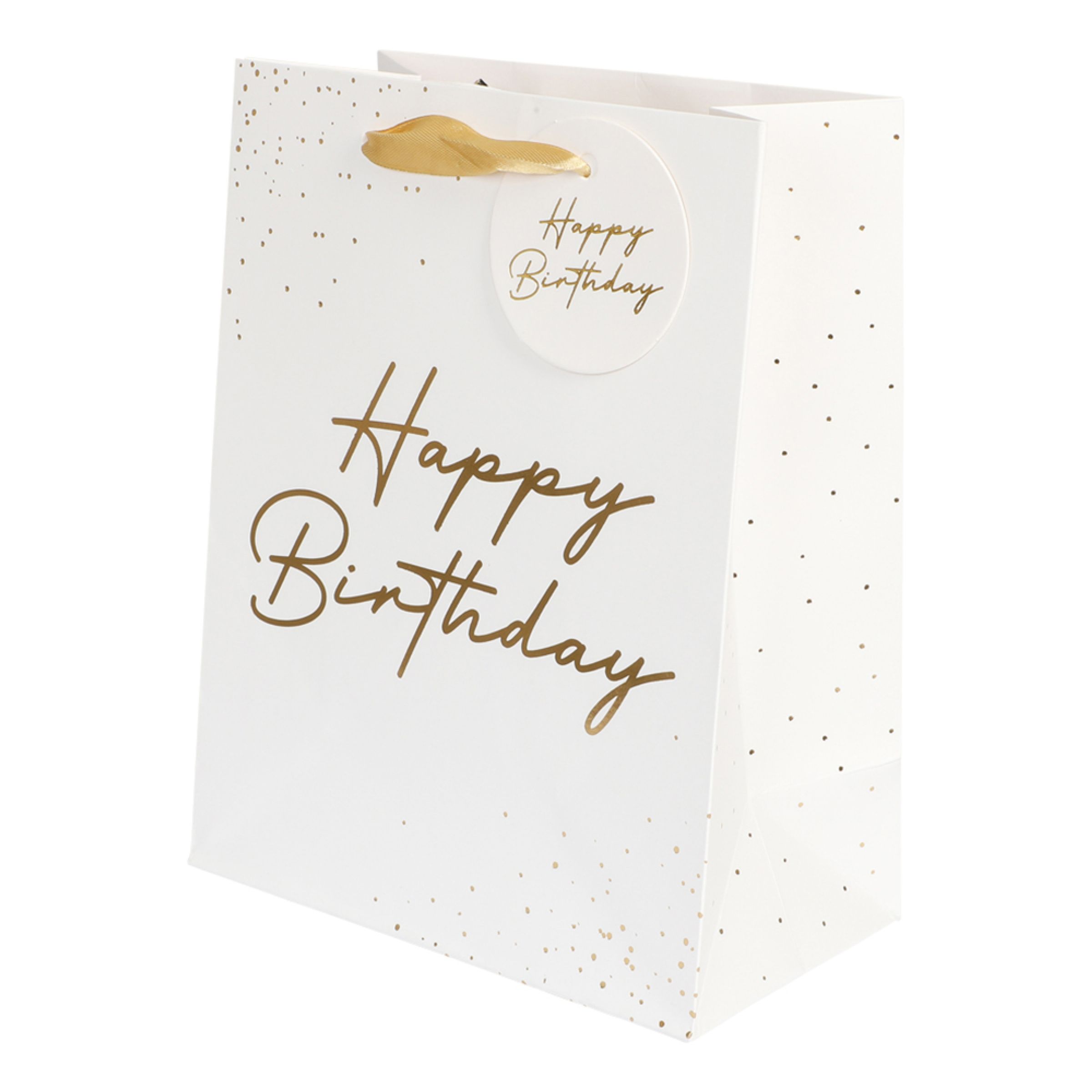 Presentpåse Guld Happy Birthday är en vit påse med guldig text som utropar "Happy Birthday!". Påsen är försedd med handtag för smidig transport. Perfekt i födelsedagstider!