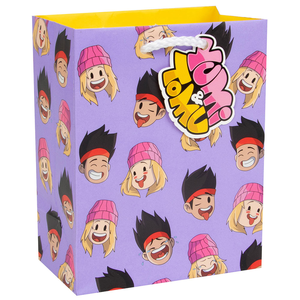 Presentpåse Liten Yumi & Tomu är en liten lila presentpåse fylld av Yumi och Tomus ansikten med olika ansiktsutryck samt en etikett med texten "Yumi & Tomu".