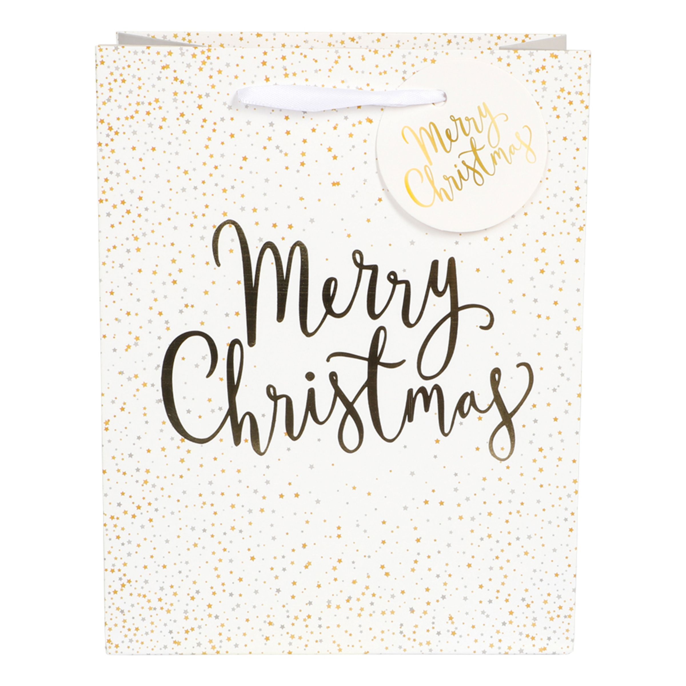 Presentpåse Merry Christmas är en superfin presentpåse med julmotiv som det står "Merry Christmas" på. Välj om du vill ha en röd, vit eller grön påse!