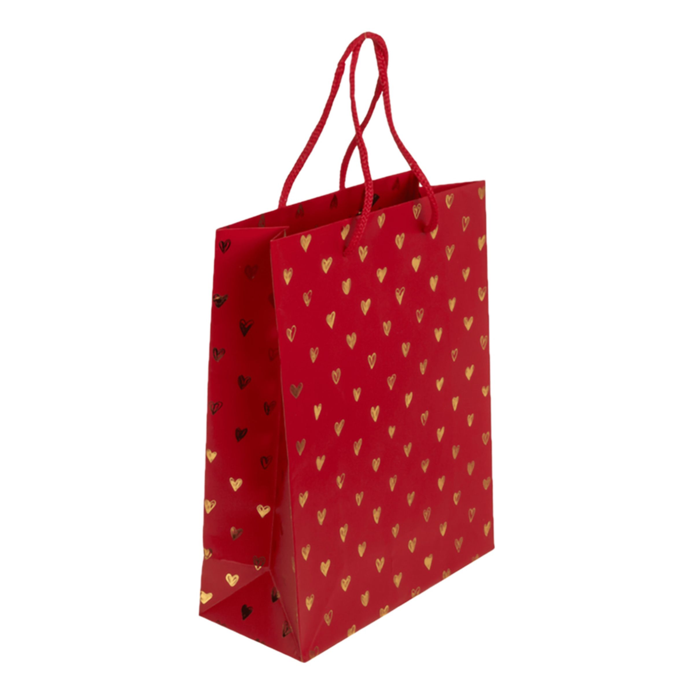 Presentpåse Röd med Hjärtan är en presentpåse i rött som pryds av små vackra hjärtan i rött eller silver (vilken du får blir en överraskning!). Påsen finns i två olika storlekar. Påsen kommer med ett smidigt snöre som bärhandtag och passar utmärkt när du ska ge bort en alla hjärtans dag-present.