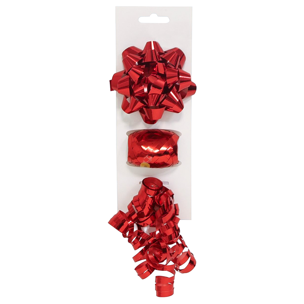 Här har du ett litet set med ett stycke stor present rosett samt presentsnöre på rulle och färdigkrullade band i snygg röd metallic att dekorera dina paket, presenter och julklappar med, de är perfekta för att få dina inslagningar att se proffsiga ut!