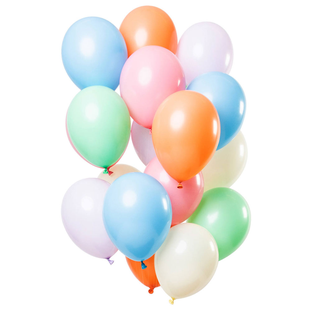 Pretty Pastels Latexballonger Mix består av 12 stycken ballonger i pastellfärgerna blått, grönt, lila, rosa, orange, gult och vitt.