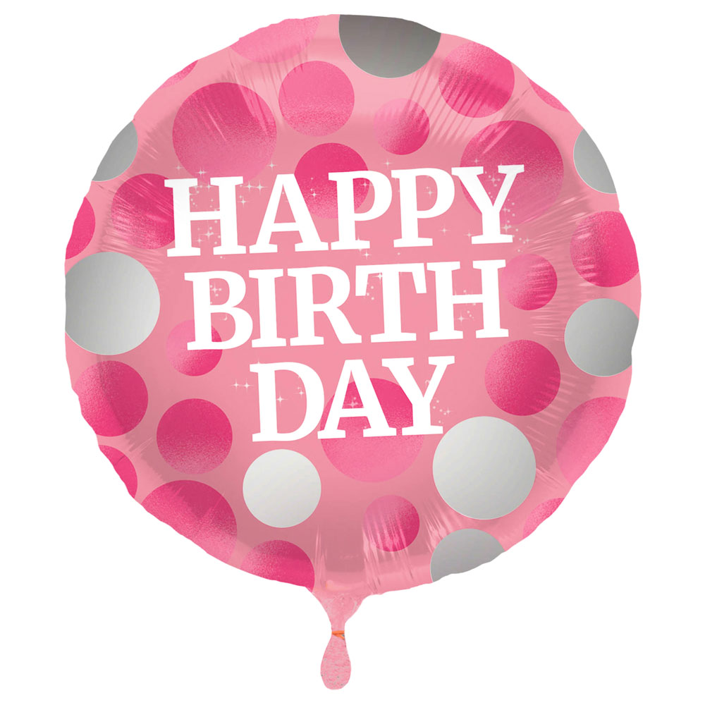 Prickig Happy Birthday Folieballong Rosa omfattar en rund folieballong i rosa med prickar i silver och rosa och texten "Happy Birthday" i vitt. Ballongen är självförslutande och fylls med helium eller luft.