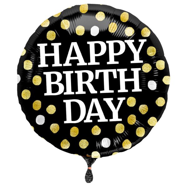 Härlig Happy Birthday folieballong för alla som gillar att fylla år! Snygg ballong i glänsande svart färg med prickar i guld och silver, och såklart en Happy Birthday text i vitt. Perfekt födelsedags ballong för att önska någon du tycker om ett riktigt stort Grattis på deras speciella dag. Fyll din ballong med helium eller luft, och du får en fin dekoration för en kul födelsedag. Denna prickiga heliumballong drar garanterat blickarna till sig, helt enkelt en perfekt födelsedagsballong!